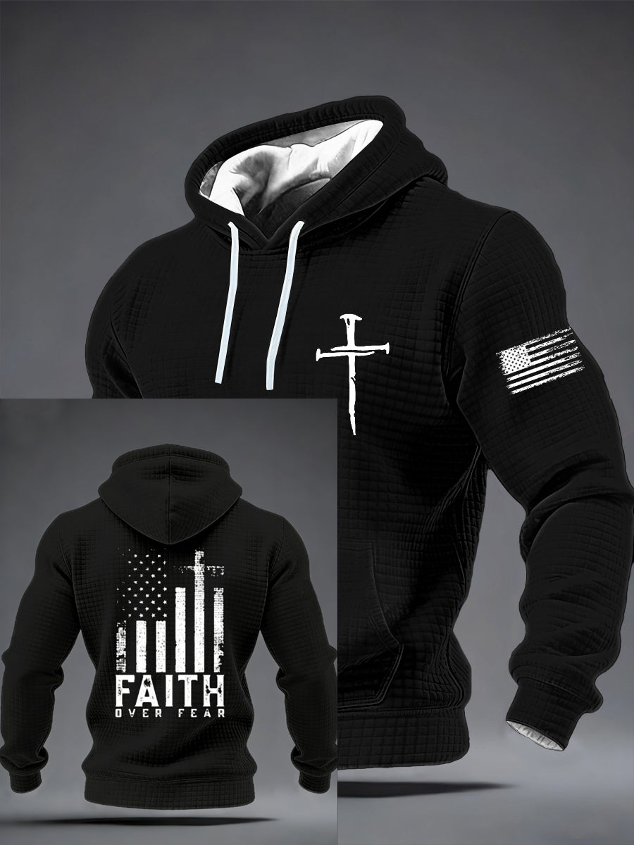 Men's Faith Over Fear Cool Christian Cross With American USA Flag Checkered Cotton Hoodie