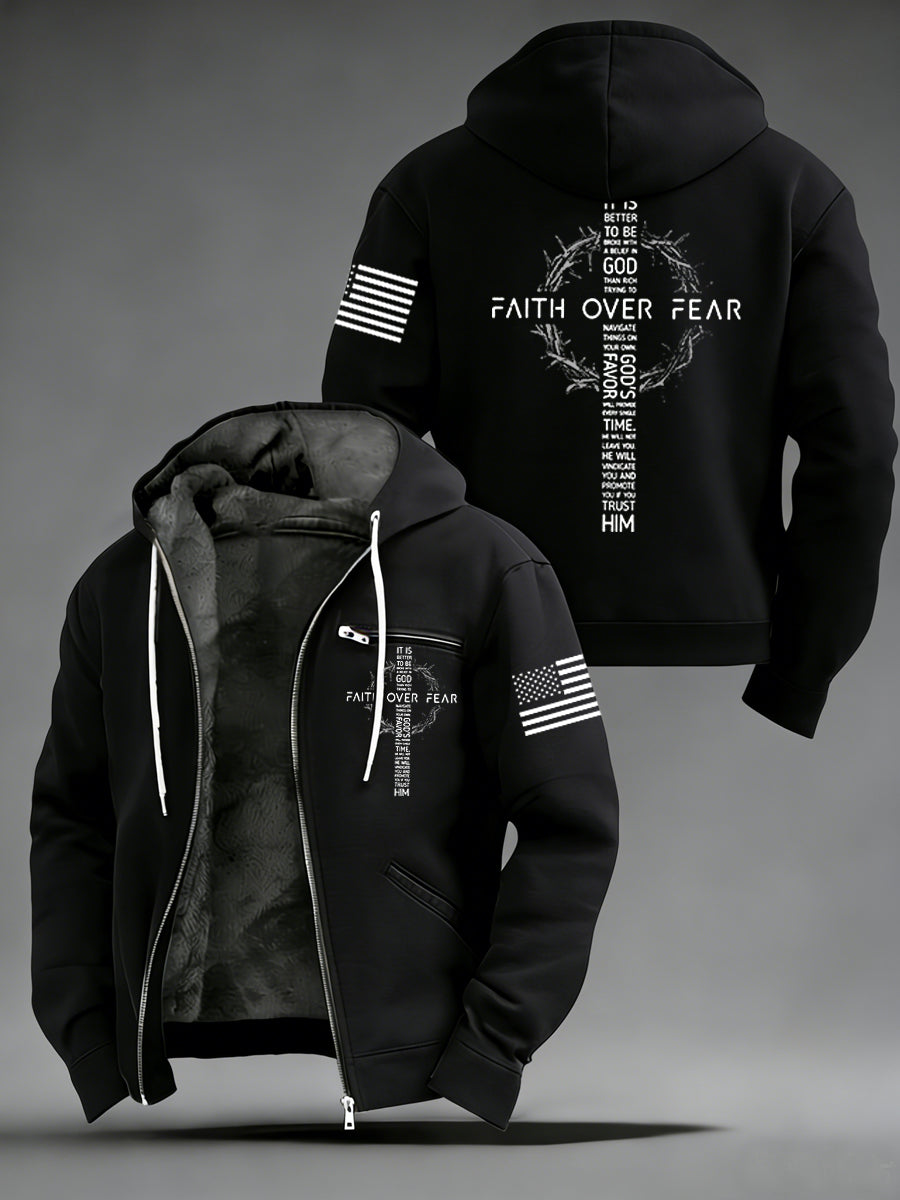 Men's Faith Over Fear USA Flag Print Casual Zipper Hooded Plush Jacket