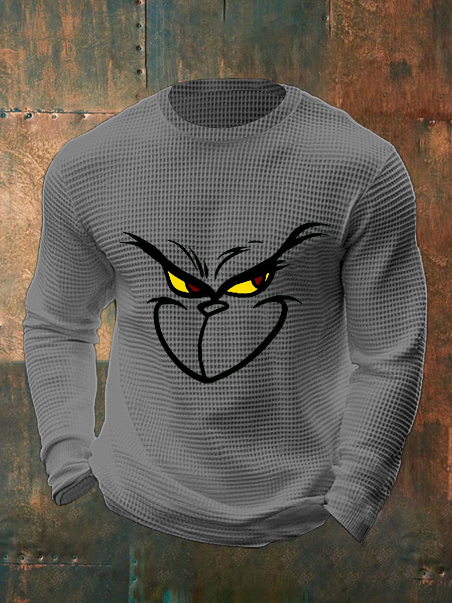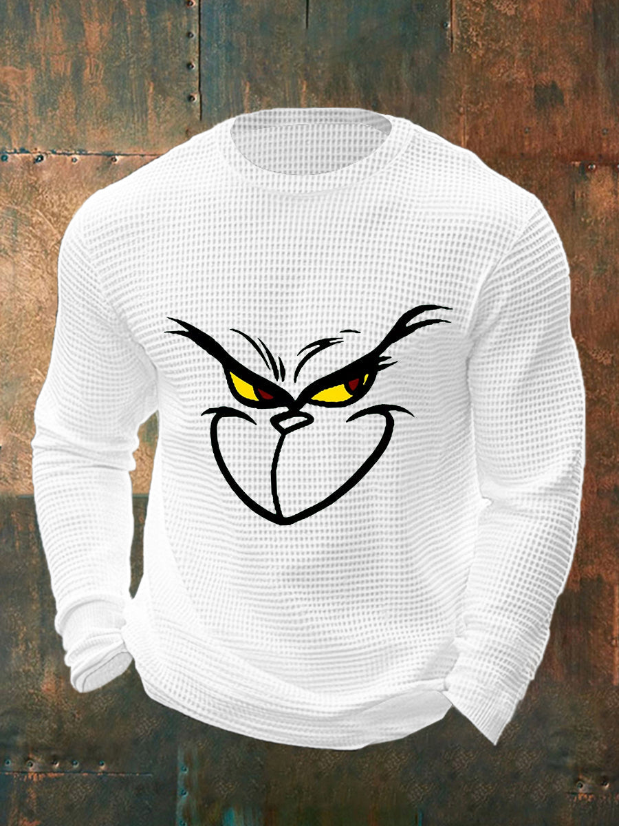 Men's Funny Classic Christmas Cartoon Character Print Casual Waffle Long Sleeve Top