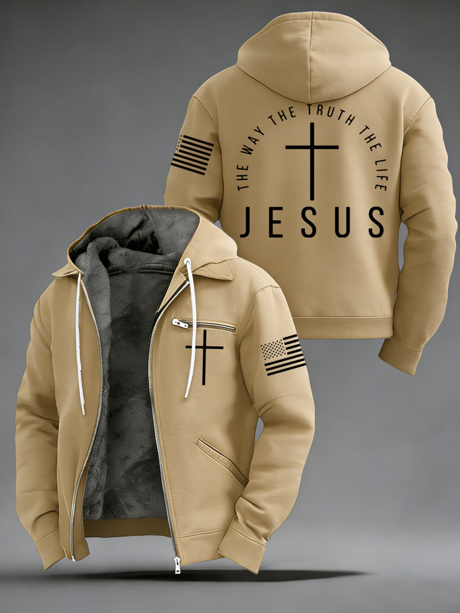 Men's Jesus The Way The Truth The Life Flag Print Casual Zipper Hooded Plush Jacket