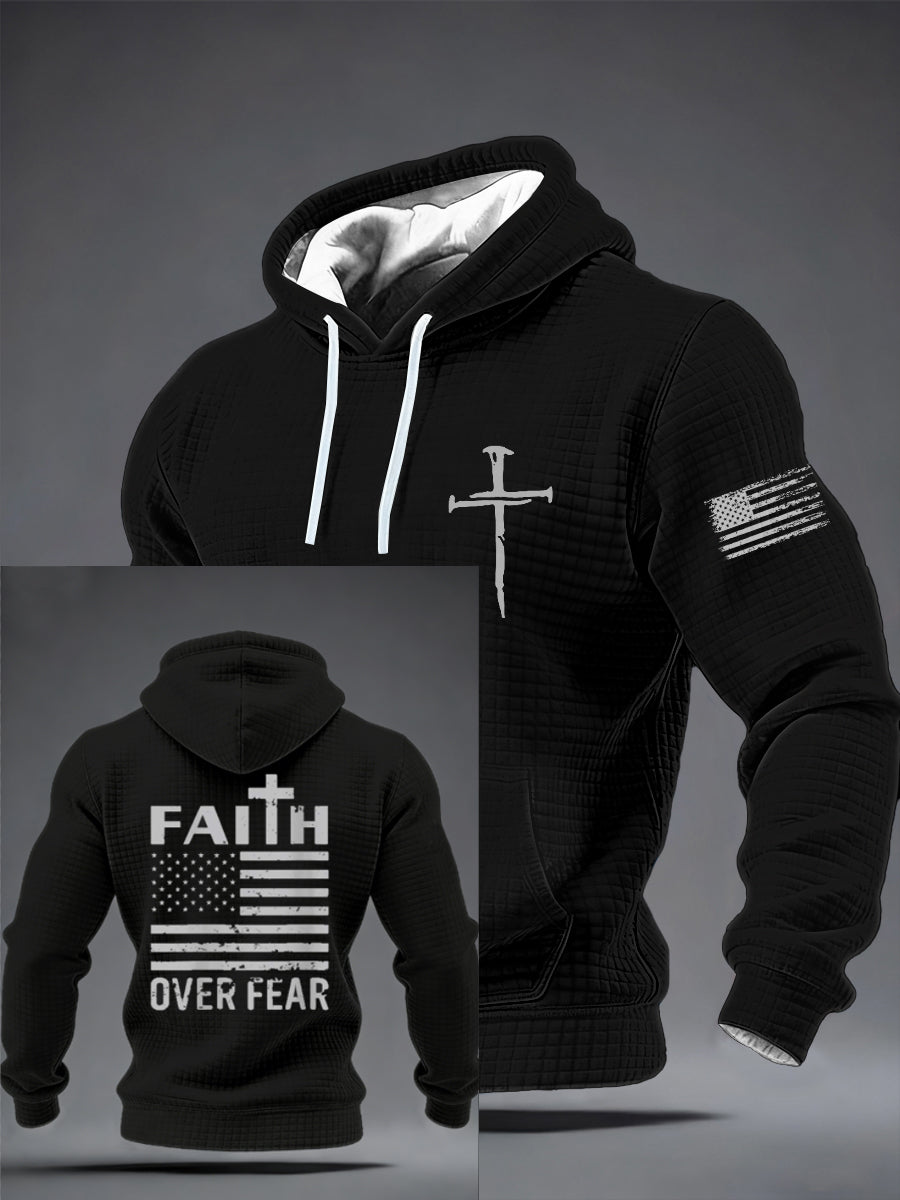 Men's US Flag Faith Over Fear Faded Patriotic Christian Checkered Cotton Hoodie