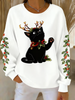 Women's Christmas Black Cat Print Ribbed Round-Neck Sweatshirt