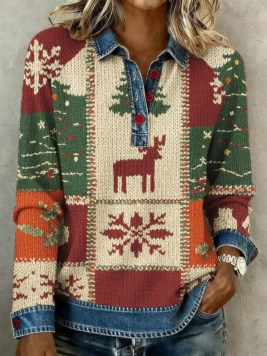 Women's Christmas Contrast Patchwork 3D Print Round-Neck Long-Sleeve T-Shirt