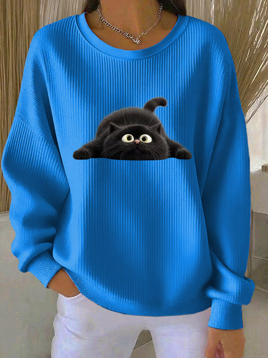 Women's Funny Black Cat Ribbed Round-Neck Sweatshirt