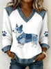 Women's Lovely Corgi Pattern Denim Patchwork V-Neck Top