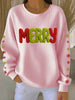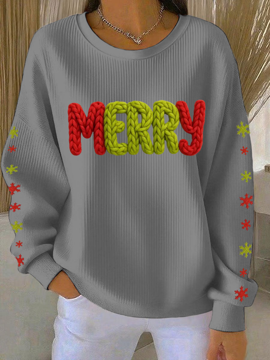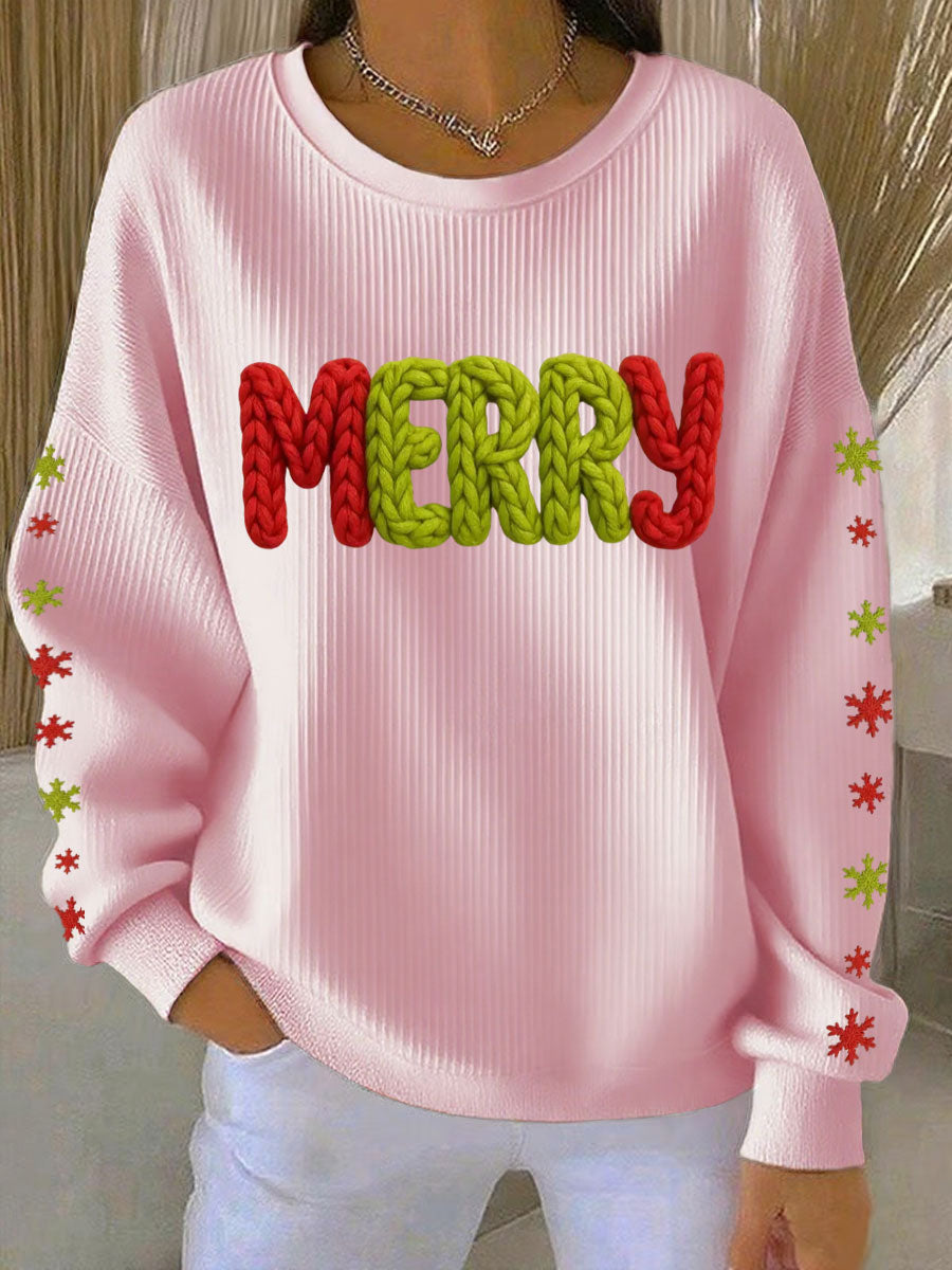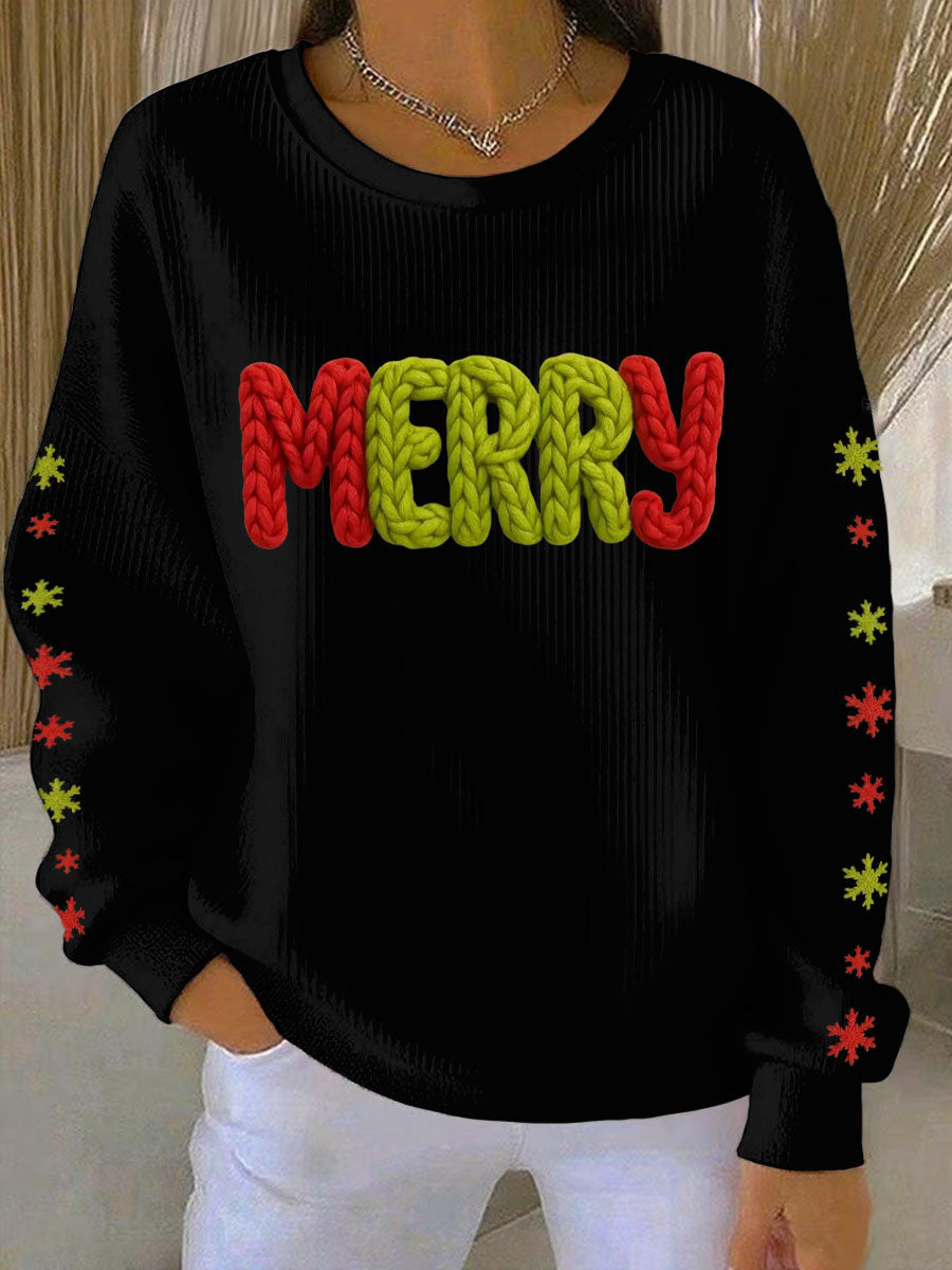 Women's Merry Print Ribbed Round-Neck Sweatshirt