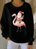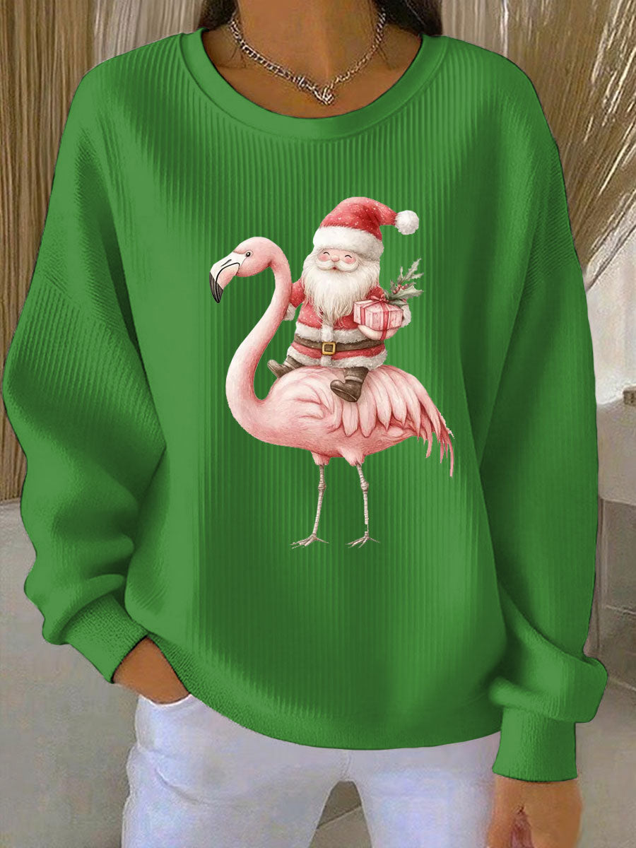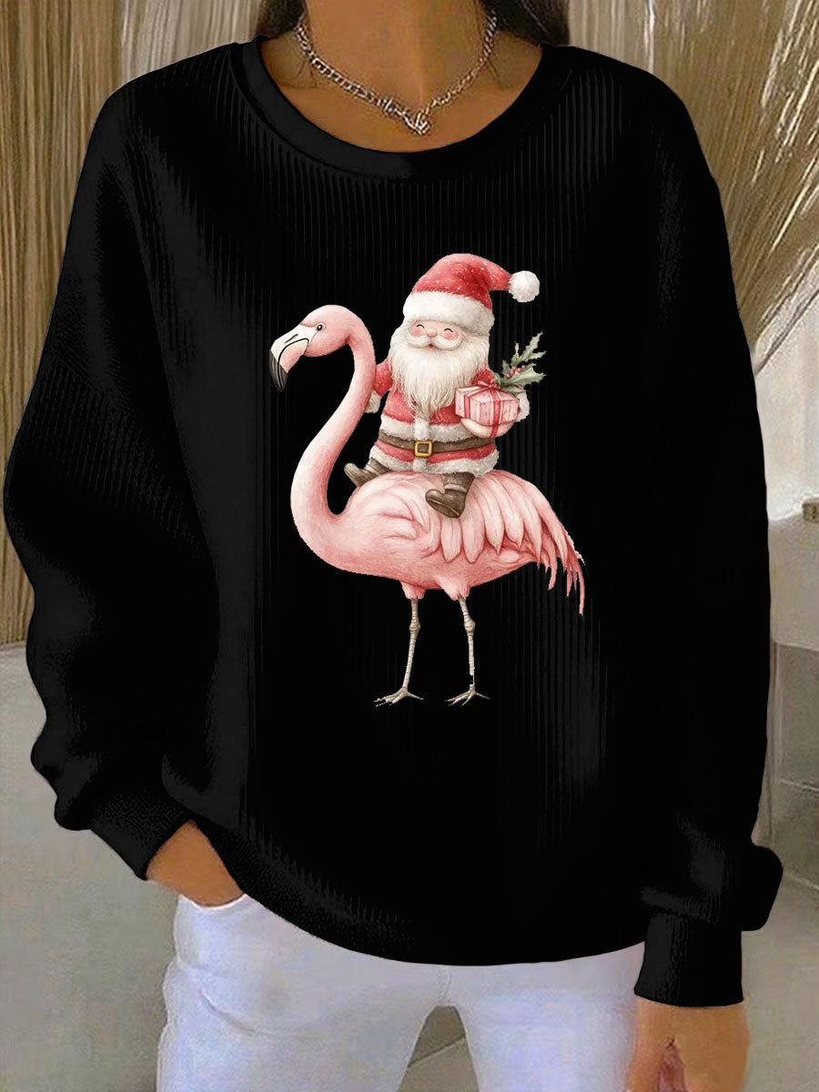 Women's Santa Claus sitting on a flamingo print Ribbed Round-Neck Sweatshirt